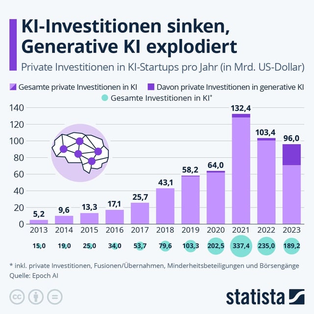 Die Investitionen in KI-Startups haben in den letzten Jahren einen bemerkenswerten Anstieg erfahren, was das wachsende Interesse und Vertrauen in generative KI-Technologien widerspiegelt. Laut einer Statistik stiegen die privaten Investitionen in KI-Startups von 3,3 Milliarden US-Dollar im Jahr 2013 auf einen Höchststand von 69,6 Milliarden US-Dollar im Jahr 2021.